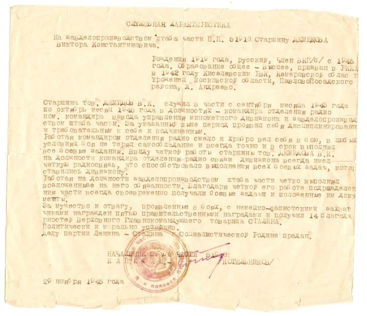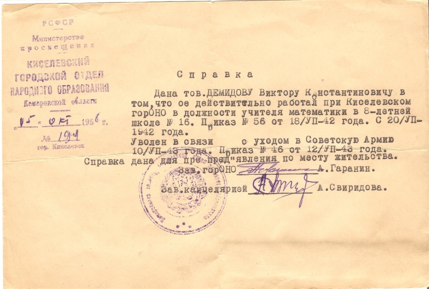 Демидов Виктор Константинович (1919-1993), муж Марии Ювенальевны. Учитель физики и математики, заведующий горОНО. Проработал в системе народного просвещения 44 года.