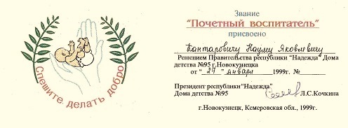 Канторович Н.Я. являлся неизменным участником и почётным гостем всех мероприятий и праздников в Доме детства № 95. Добрые, мудрые напутствия и поздравления Наума Яковлевича всегда шли от сердца, такого большого, в котором умещалась любовь ко всему коллективу сотрудников и воспитанников детского дома, который стал для него близким и родным. Нас же переполняла гордость за этого удивительного человека, выбравшего раз и навсегда великую миссию – нести знания, помогать каждому, кто рядом, становиться Человеком!