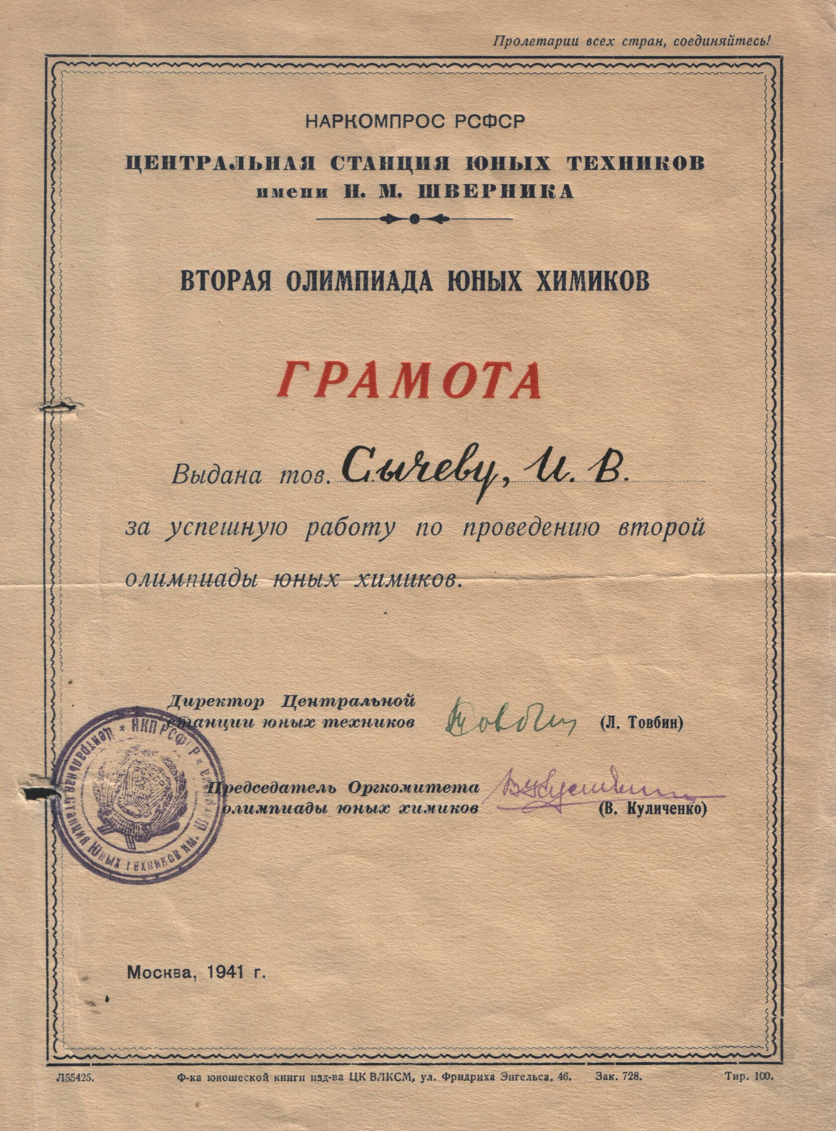 Из воспоминаний И. В. Сычёва: «Война началась 22 июня 1941 года и ровно через месяц меня мобилизовали и отправили на Дальний Восток. В то время я работал директором средней школы №10 города Новокузнецка и преподавал химию. Вот это и определило мою дальнейшую судьбу в армии. До войны никогда я не служил в армии и не был на сборах, но меня сразу же назначили преподавать военно–химическое дело во Владивостоке в военно – пехотном училище и присвоили звание младший техник – лейтенант. Пришлось на ходу перестраиваться из преподавателя химии в преподавателя военно – химического дела.